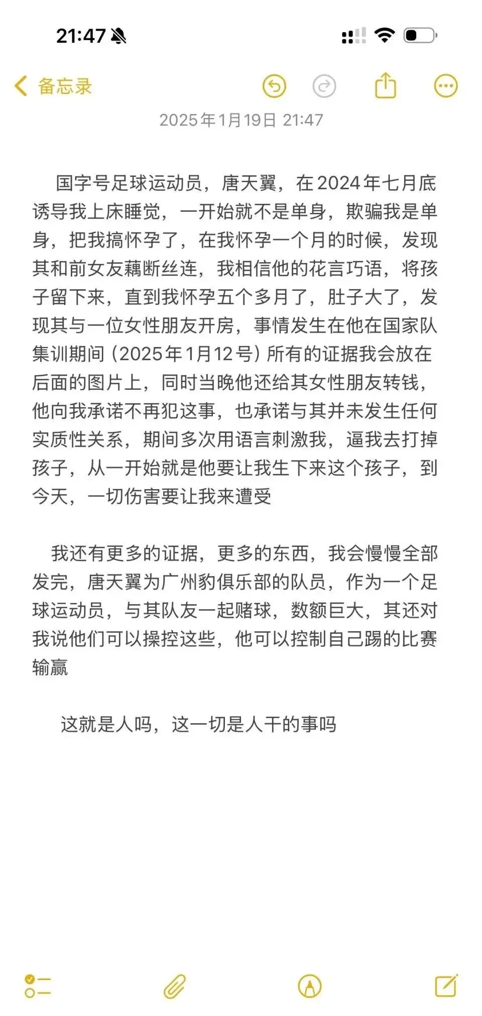 点击输入图片描写(最多30字)但是,就在球迷们为中国足球有这么的一位但愿之星而感到欢畅之时,却传来了对于他的丑闻。网友“唐天翼女一又友”在网上发起程文并配上洽商的图片凭证,默示唐天翼个东说念主说念德壅塞,不仅期骗其上床,而且还导致其孕珠。不仅如斯,唐天翼还到处出轨,与多位女性有不一样的关系。何况,这位网友还爆料称其出轨的一位对象,疑似为不异为足球通顺员,何况照旧在广州踢球的国字号女足球员。